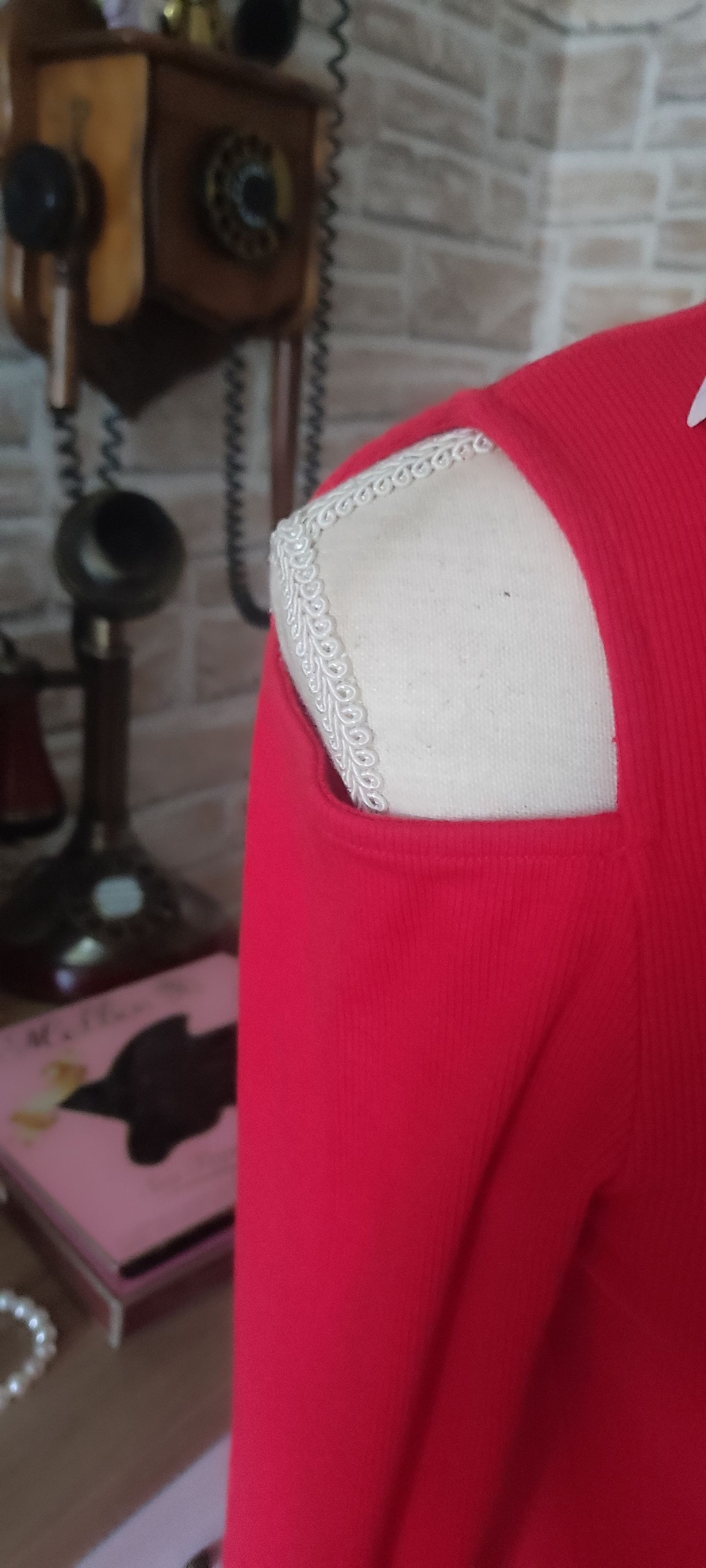 Stylové červené šaty s dlouhým rukávem a zajímavým střihem. Materiál je elastický, pohodlné na nošení.